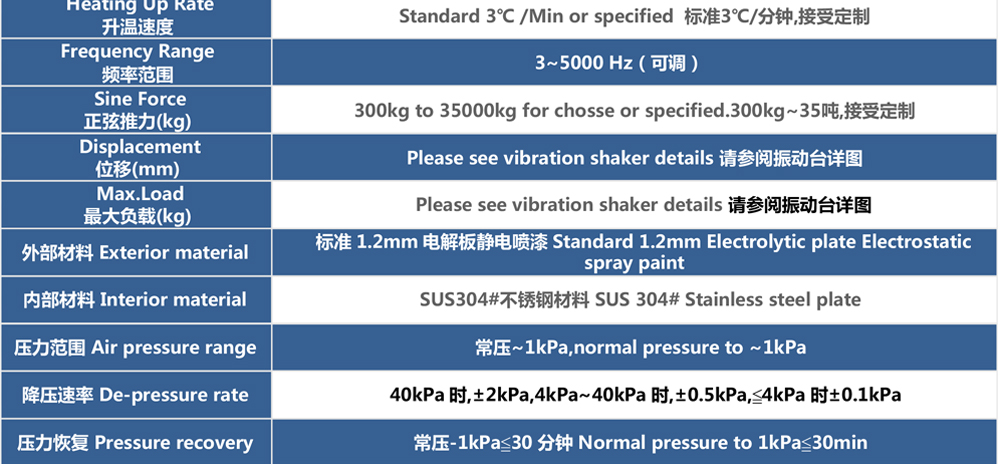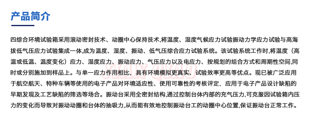 用途:四綜合環(huán)境試驗箱采用滾動密封技術(shù)、動圈中心保持技術(shù),將溫度、濕度氣候應(yīng)力試驗振動力學應(yīng)力試驗與高海拔低氣壓應(yīng)力試驗集成一體,成為溫度、濕度、振動、低氣壓綜合應(yīng)力試驗系