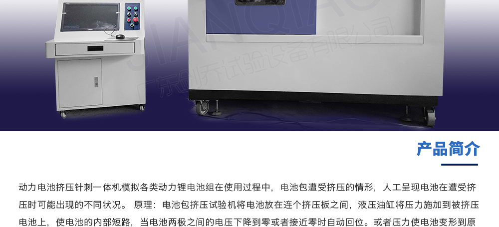 用途:動(dòng)力電池?cái)D壓針刺一體機(jī)模擬各類(lèi)動(dòng)力鋰電池組在使用過(guò)程中,電池包遭受擠壓的情形,人工呈現(xiàn)電池在遭受擠壓時(shí)可能出現(xiàn)的不同狀況。 原理:電池包擠壓試驗(yàn)機(jī)將電池放在連個(gè)擠壓