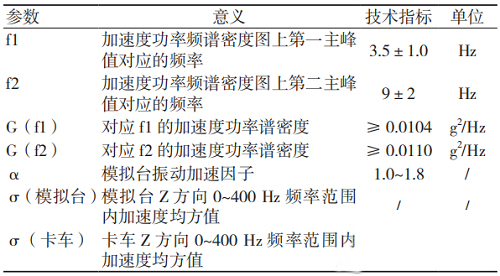 模擬運輸臺的設(shè)計參數(shù)主要依據(jù)《QJ/T 815.2-94產(chǎn)品公路運輸加速模擬試驗方法》[3]設(shè)定。該標(biāo)準(zhǔn)中規(guī)定了模擬運輸臺的關(guān)鍵技術(shù)指標(biāo),見表1。